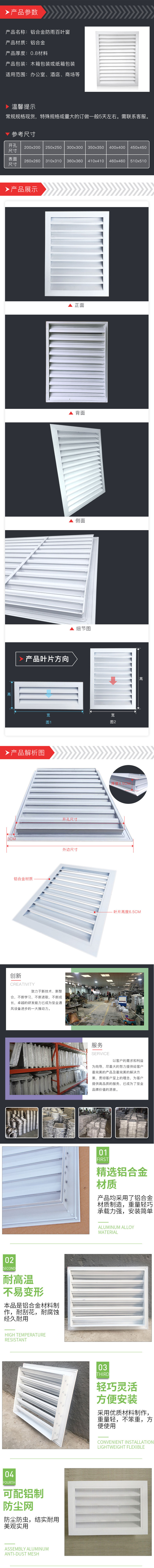 防雨百叶主要应用于通风工程,作用是防雨通风的。是由防雨叶片和带滴水框的侧框架组成的,通风工程用。